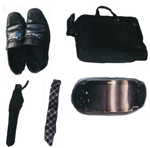 | 着衣等 | 黒色スーツ上下、白色カッターシャツ、紺色チェック柄ネクタイ 黒色ビジネスバック、折りたたみ傘、ゲーム機(PS Vita 黒色) |